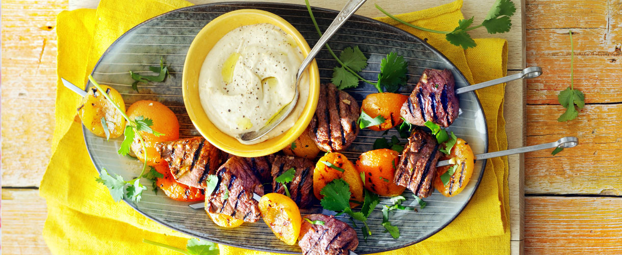 Abrikozen rundvlees brochettes met koriander en hummus