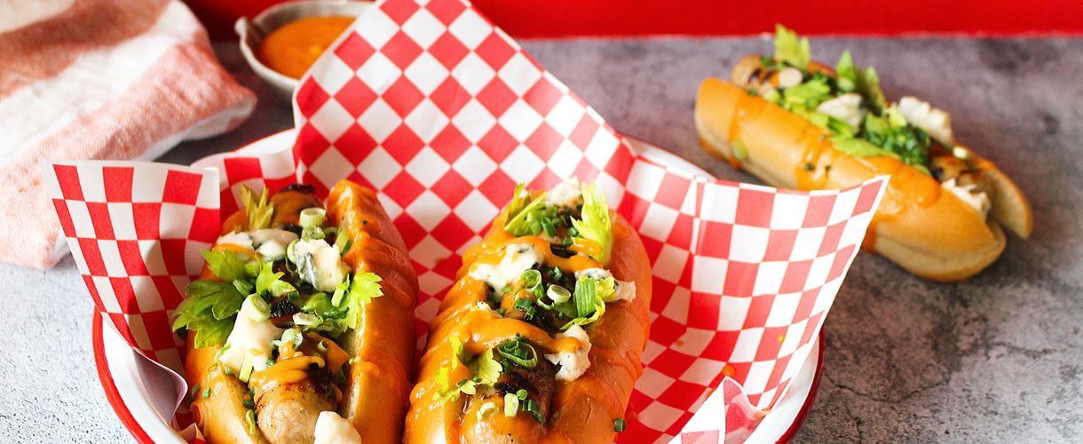 Hot Dogs with Apricot Buffalo Sauce, Blue Cheese, Celery Leaves